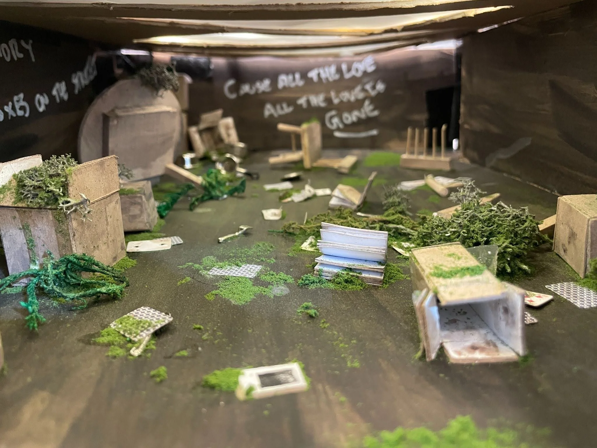 I analyzed Yard Sale while focusing on its depiction of loss, nostalgia, and resilience. Conceptualized the installation as a symbolic representation of discarding painful memories while embracing the need to move forward. After that I let my creative freedom take over and basically made a mess to make it feel abandoned. I used materials such as cardboard, cardstock, various watered down acrylic paints, miniature doll furniture, miniature plants, and other debris.
